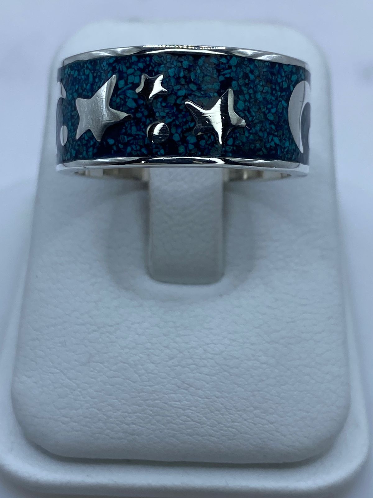 Su diseño tipo banda ofrece presencia visual y comodidad, ideal como anillo unisex con carácter simbólico o pieza especial para amantes de la astrología y el universo.