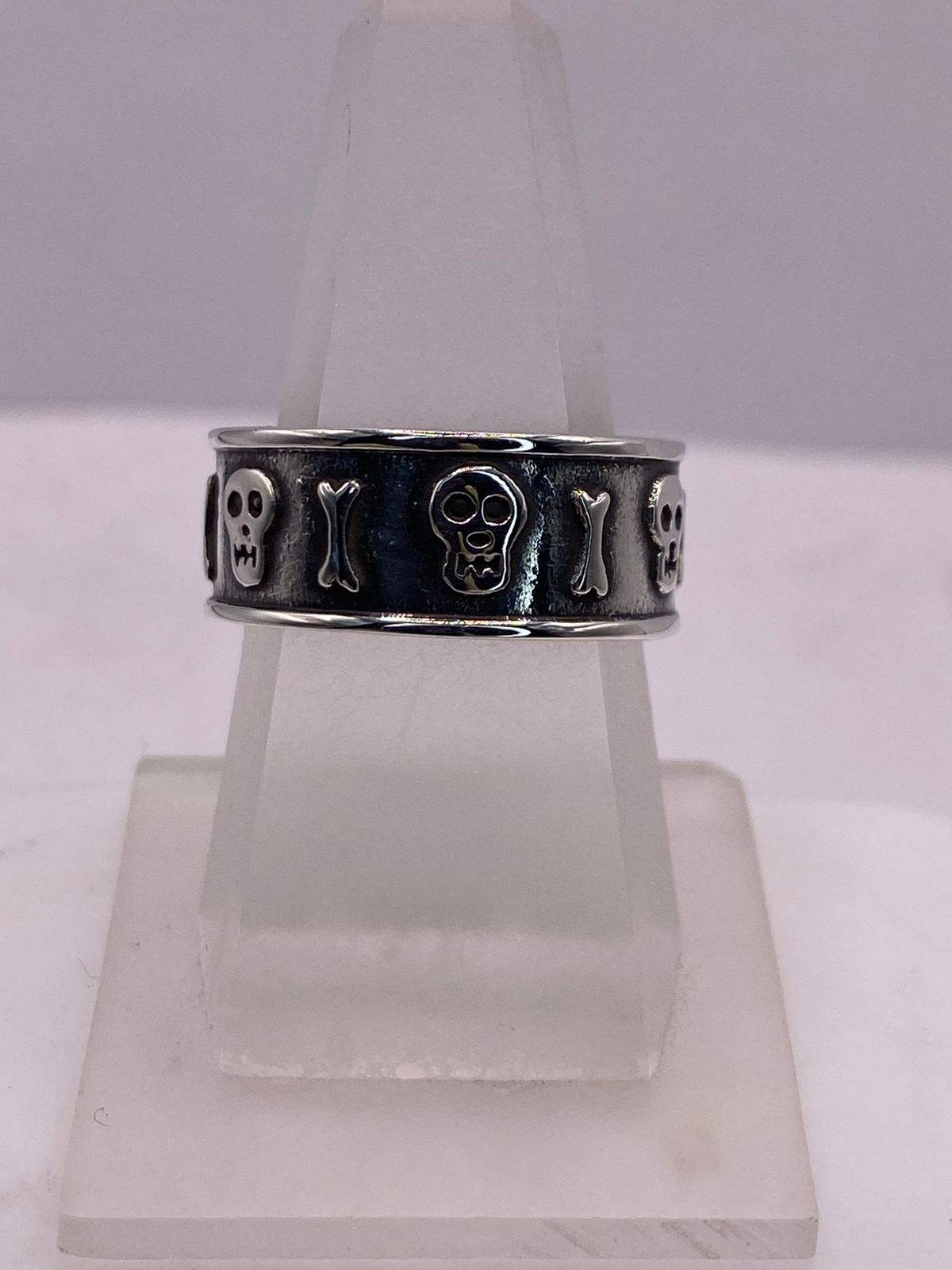 El diseño presenta una secuencia de calaveras y huesos en relieve, cuidadosamente detallados sobre un fondo oscuro oxidado que resalta cada figura. El contraste entre el acabado envejecido del centro y los bordes pulidos espejo crea una estética poderosa y sofisticada.