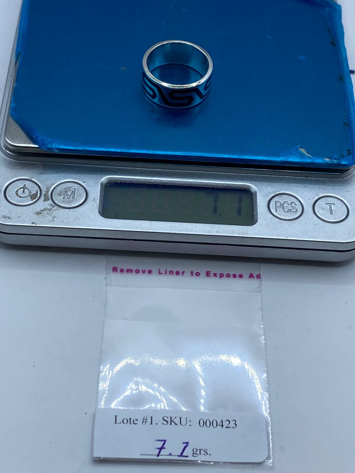 El patrón tipo greca estilizada envuelve la pieza con líneas continuas que evocan movimiento, equilibrio y estructura. El fondo de obsidiana negra intensifica el contraste, resaltando la pureza del brillo plateado. 🖤⚡