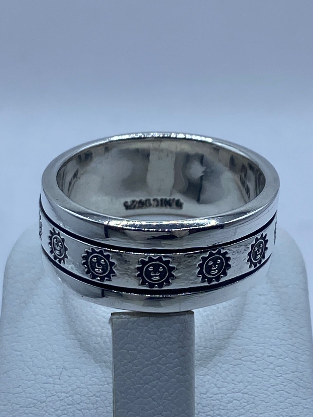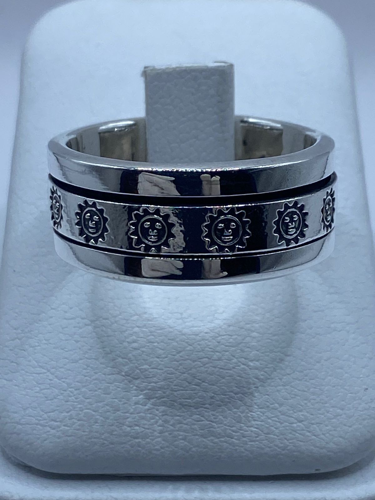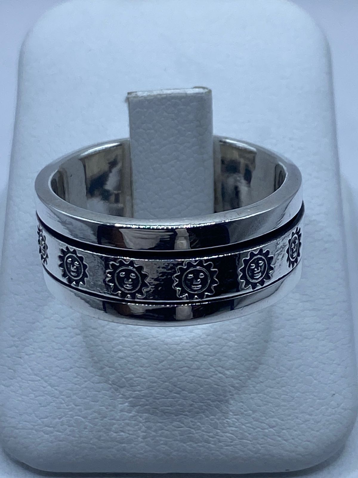 Este impactante anillo spinner de plata .925 presenta un hermoso diseño de soles en relieve, símbolo universal de energía, vida y renovación ☀️✨.