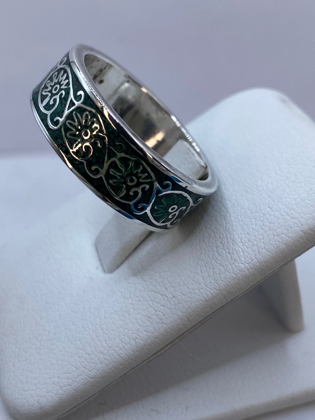 El intenso verde de la malaquita natural crea un fondo vibrante que resalta los delicados motivos florales y arabescos trabajados en plata .925. Cada detalle calado aporta ligereza visual y refinamiento, creando un equilibrio perfecto entre naturaleza y artesanía 🌸.