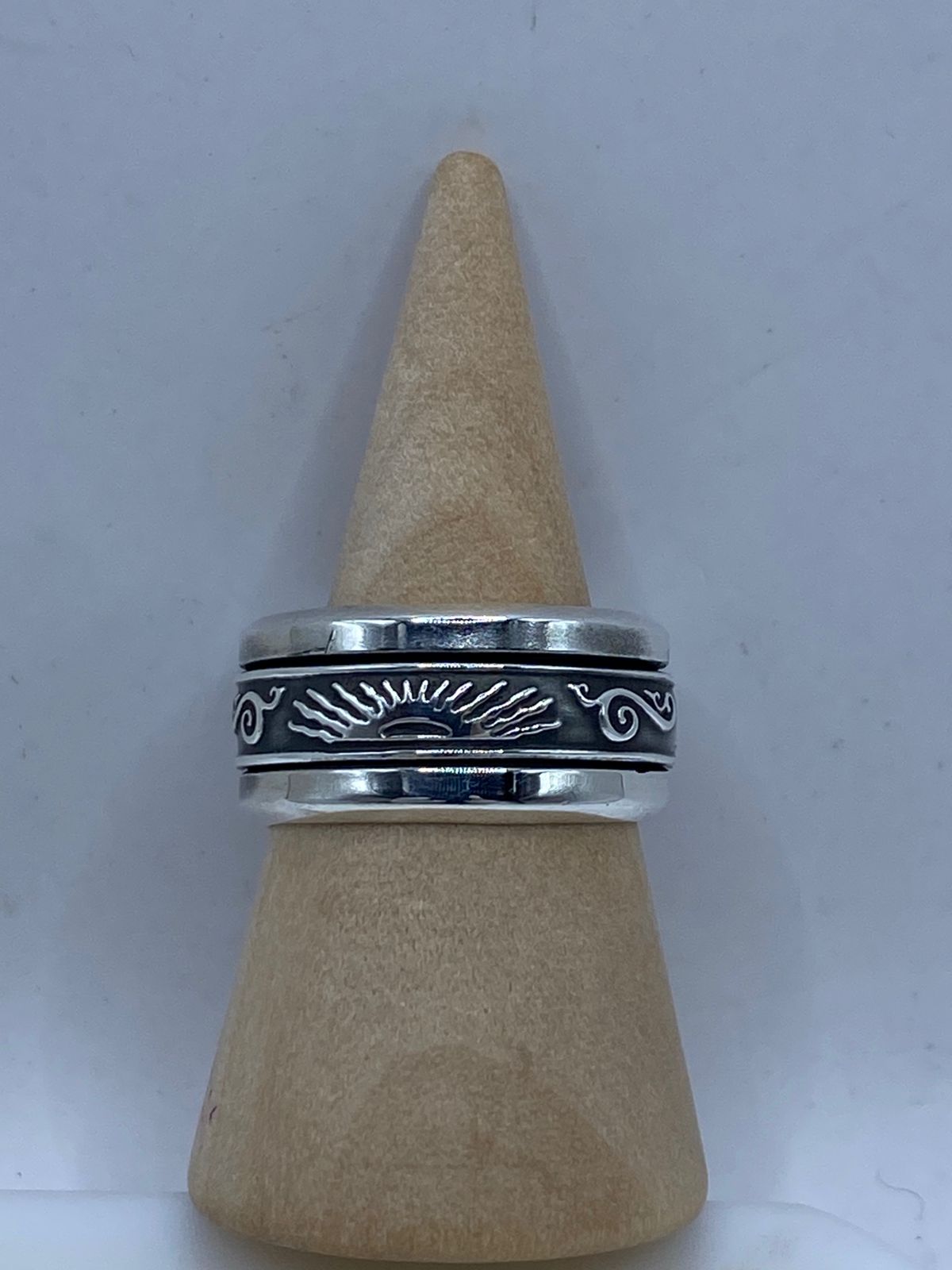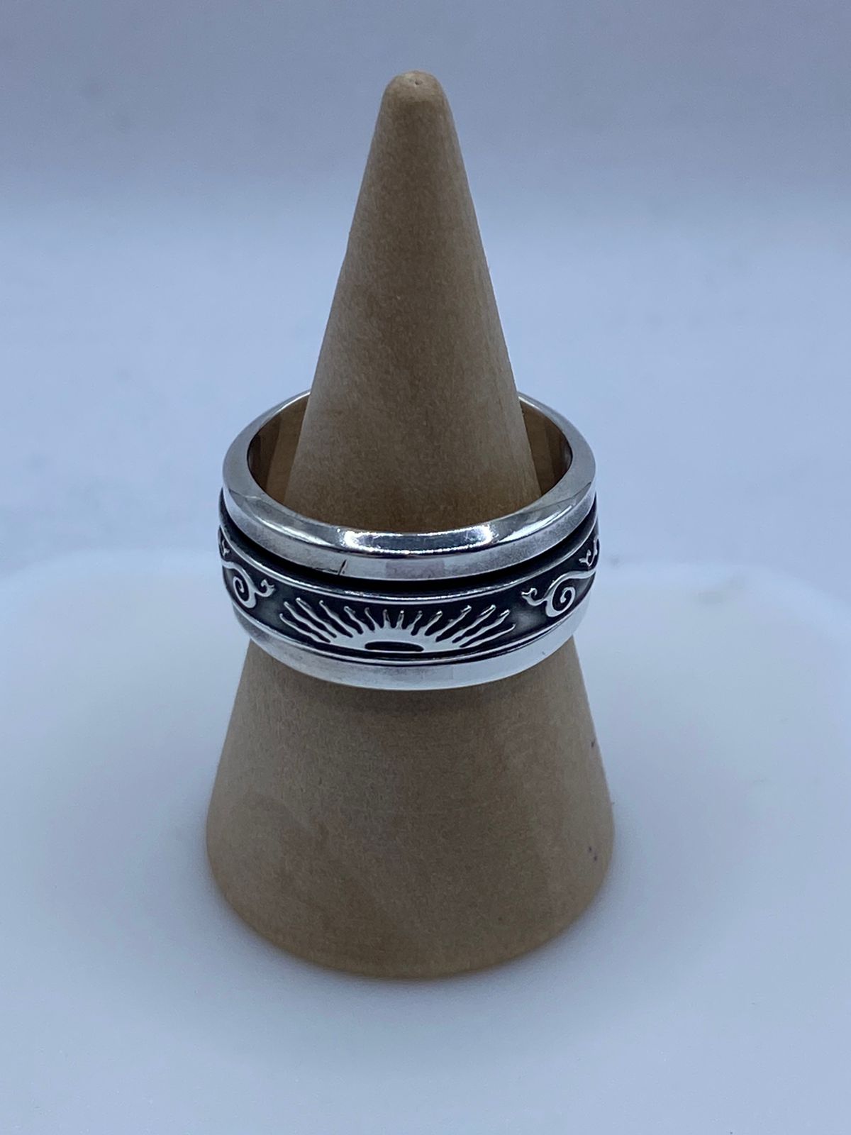 Este elegante anillo giratorio de plata esterlina 925 destaca por su diseño inspirado en el sol naciente 🌞, símbolo de energía, renovación y nuevos comienzos. La banda central móvil presenta un sol en relieve con rayos extendidos, acompañado de delicados detalles ornamentales a los lados 🌀.