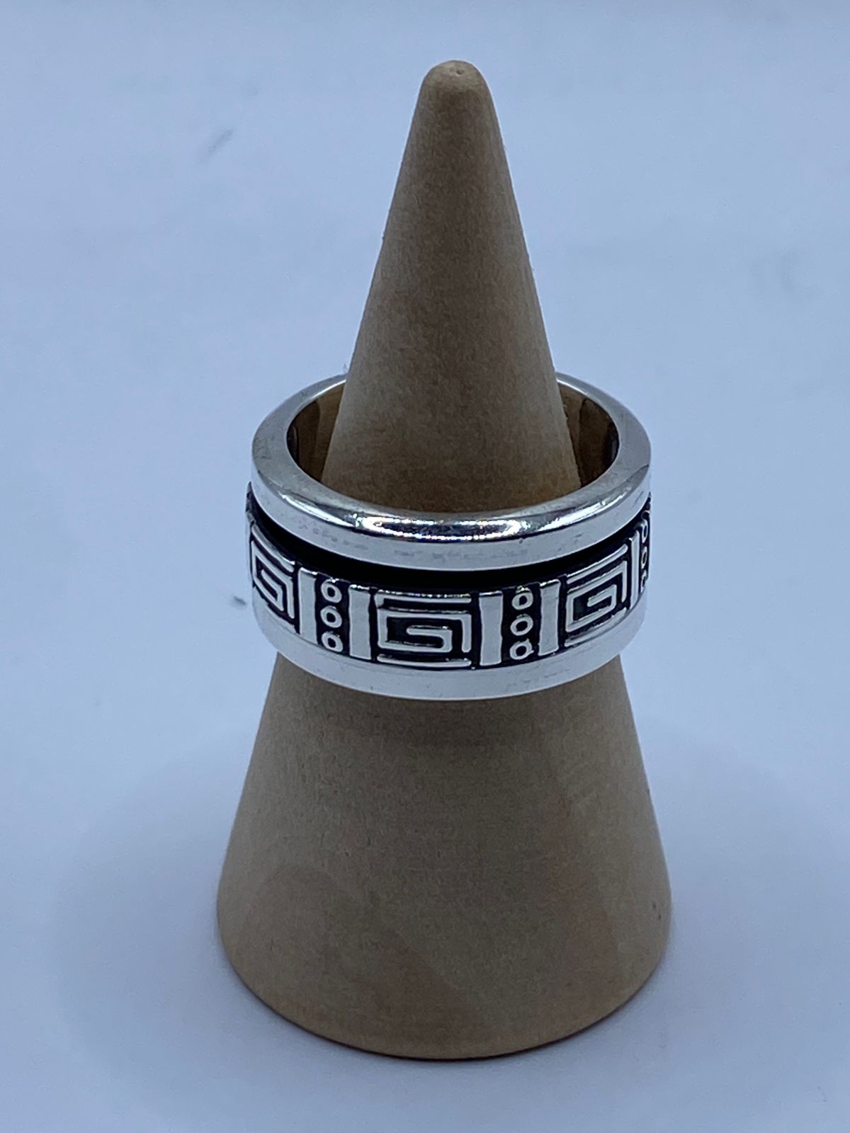 Este elegante anillo giratorio de plata 925 presenta un diseño inspirado en grecas geométricas de estilo prehispánico ✨. Su banda central móvil está decorada con un patrón continuo de líneas escalonadas y detalles simétricos 🔷, símbolos asociados con continuidad, equilibrio y conexión ancestral.