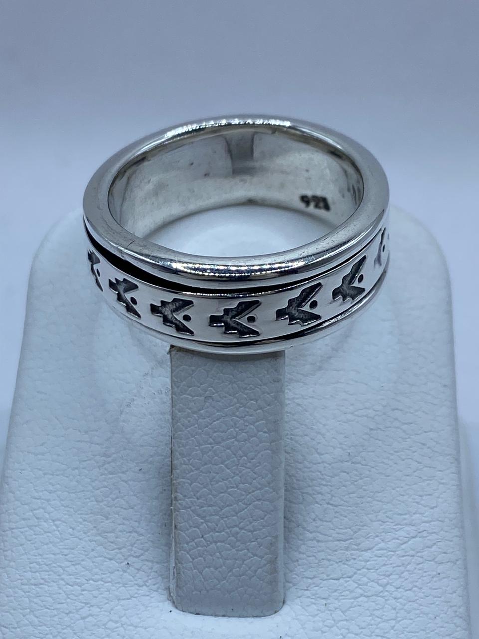 Este llamativo anillo giratorio de plata 925 presenta un diseño tribal inspirado en flechas estilizadas 🏹✨, símbolo de dirección, fuerza y determinación. La banda central móvil muestra un patrón continuo de figuras angulares en relieve que aportan carácter y un estilo audaz.