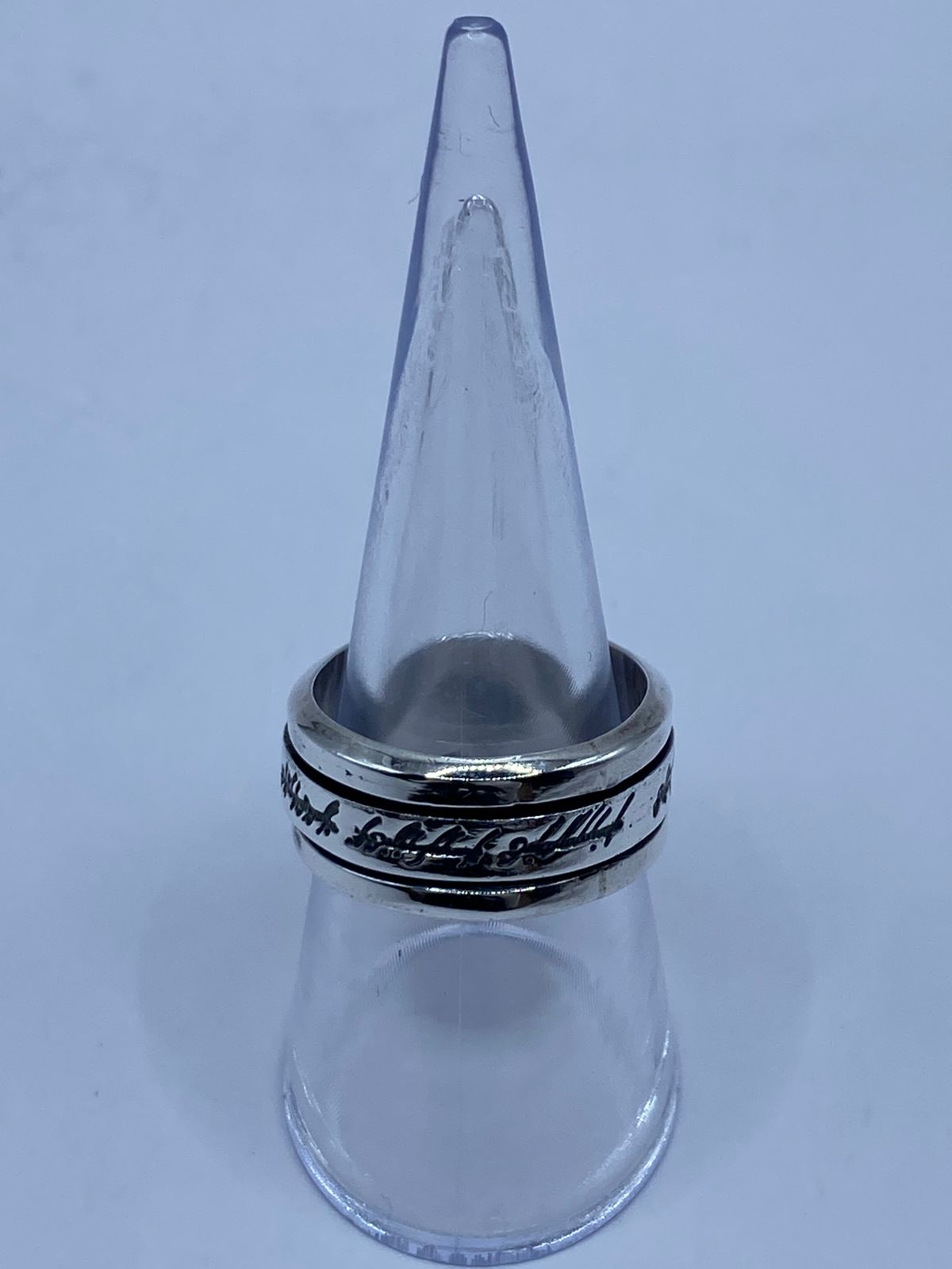 Este impactante anillo giratorio de plata 925 está inspirado en la estética épica de El Señor de los Anillos 🧙♂️🔥. Su banda central móvil presenta una inscripción con estilo antiguo que evoca la legendaria escritura élfica, aportando un aire místico y poderoso.