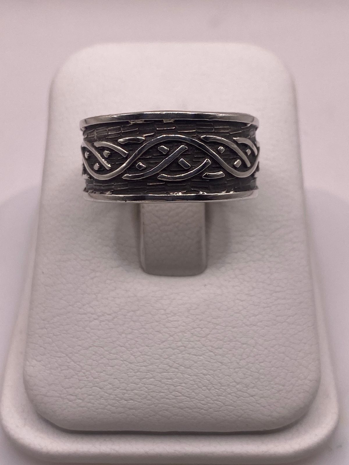 El anillo combina un acabado pulido en plata con detalles oxidados que realzan la profundidad y textura del motivo trenzado celta. Su banda sólida y cómoda lo hace ideal para el uso diario, manteniendo al mismo tiempo un carácter artesanal distintivo.