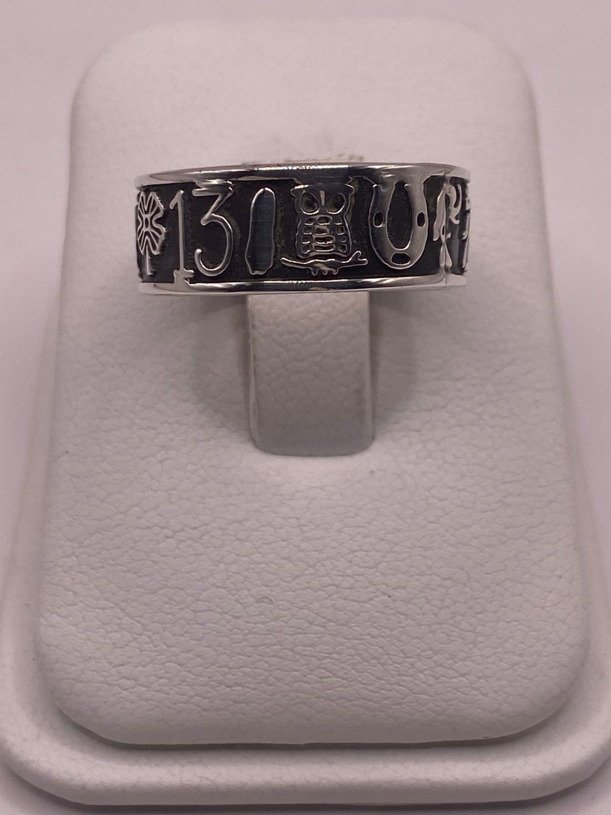Este anillo de plata esterlina 925 presenta un diseño distintivo grabado con símbolos clásicos de buena fortuna y protección, cuidadosamente detallados sobre un fondo oxidado que realza cada figura. Entre los motivos se aprecian elementos tradicionales asociados a la suerte y el camino, aportando un carácter simbólico y artesanal a la pieza.