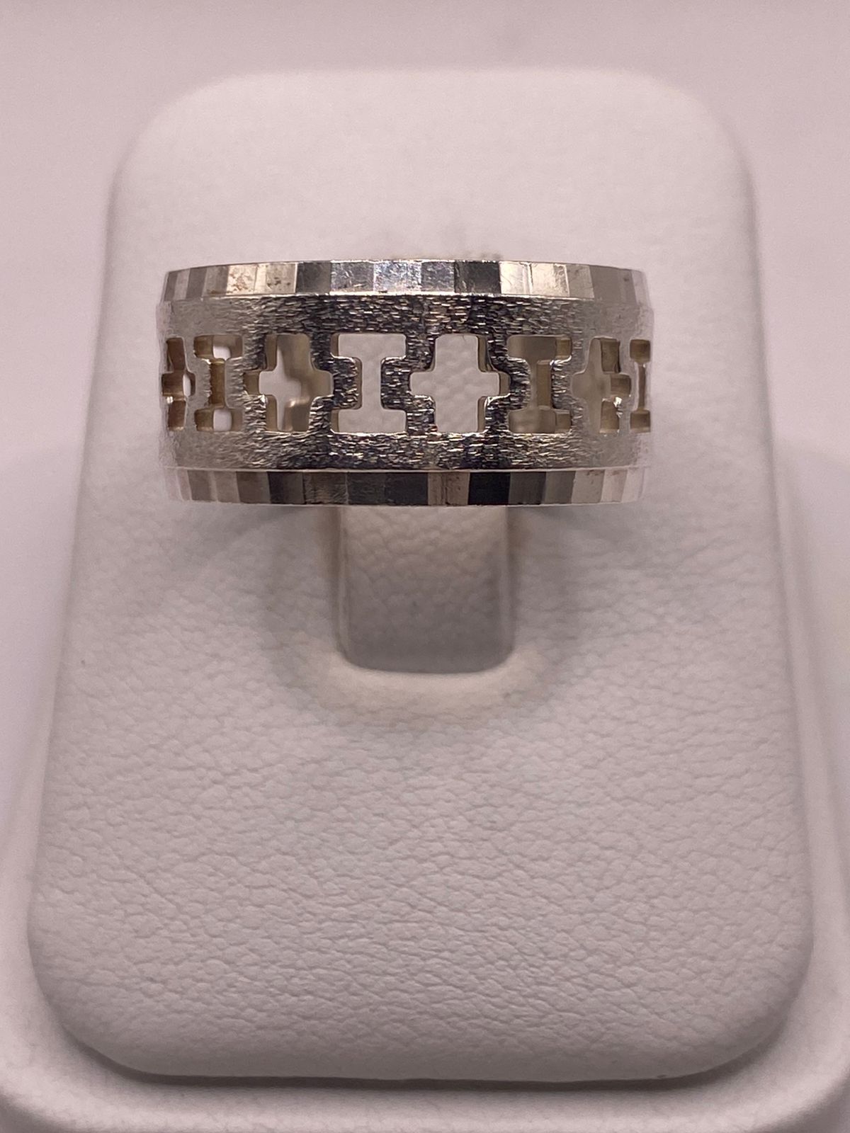 Este llamativo anillo de plata esterlina presenta un diseño calado audaz con motivos repetidos de cruces, creando una estética distintiva y atemporal. Elaborado en plata esterlina 925 de alta calidad, el anillo combina una banda central texturizada con bordes finamente pulidos que realzan su profundidad visual y brillo.