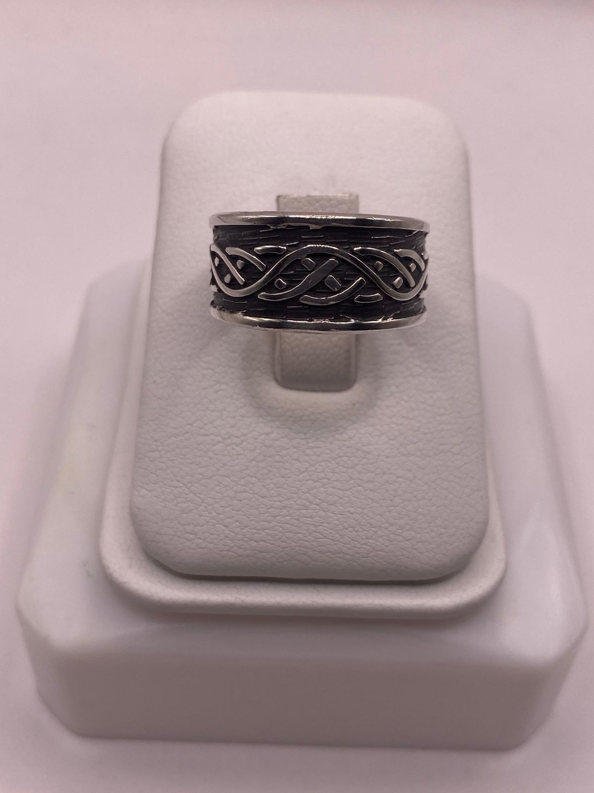 Este elegante anillo de plata esterlina destaca por su diseño de trenzado continuo con un motivo tipo infinito, símbolo de unión, equilibrio y continuidad. El contraste entre el fondo oscuro texturizado y el relieve pulido del trenzado realza los detalles del diseño y aporta profundidad visual a la pieza.